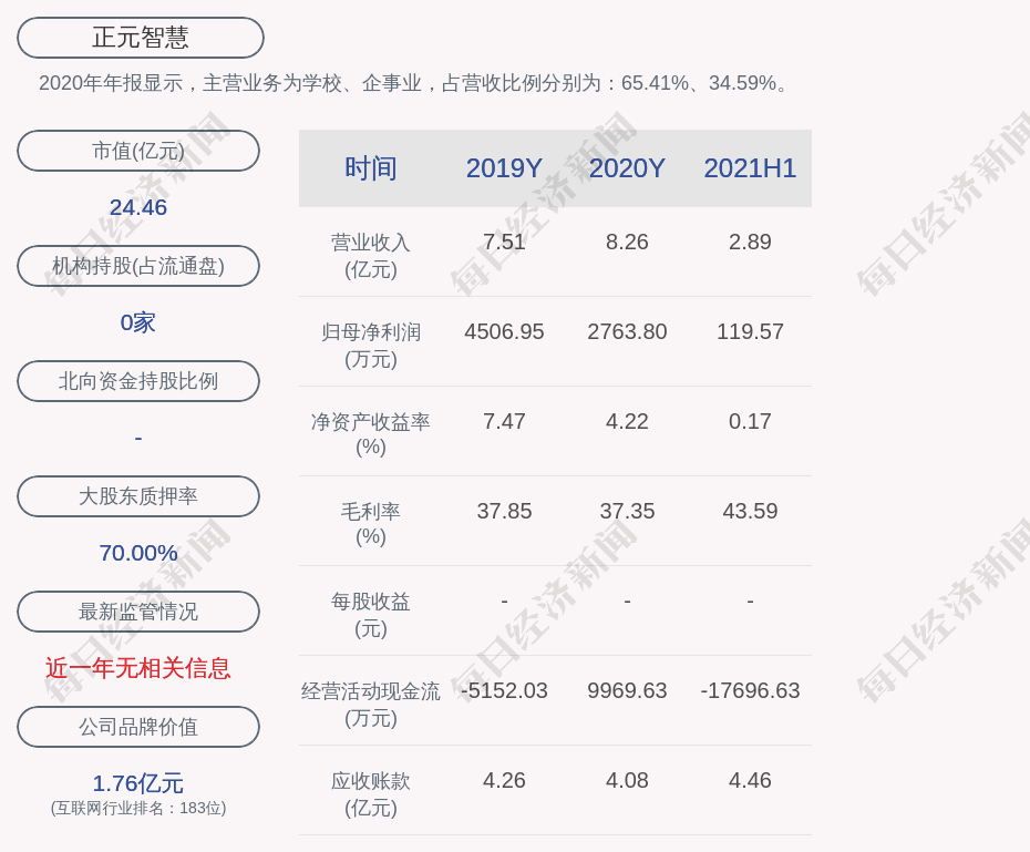 2020年年報(bào)顯示,正元智慧的主營業(yè)務(wù)為學(xué)校、企事業(yè),占營收比例分別為:65.41%、34.59%。