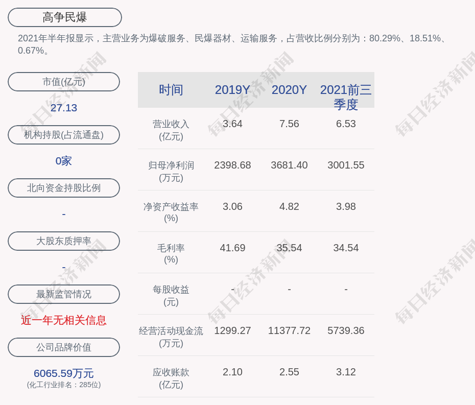 2021年半年報(bào)顯示,高爭(zhēng)民爆的主營(yíng)業(yè)務(wù)為爆破服務(wù)、民爆器材、運(yùn)輸服務(wù),占營(yíng)收比例分別為:80.29%、18.51%、0.67%。