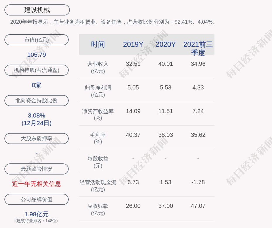 2020年年報顯示,建設機械的主營業(yè)務為租賃業(yè)、設備銷售,占營收比例分別為:92.41%、4.04%。