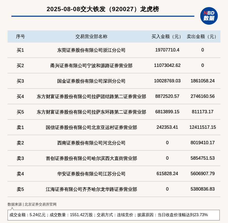 每經(jīng)訊,2025年8月8日,北交所上市公司交大鐵發(fā)(920027,收盤價:35.98元)登上龍虎榜,交易方式是連續(xù)競價,披露原因是當(dāng)日收盤價漲幅達到23.73%,成交數(shù)量1551.42萬股,成交金額5.24億元。買一席位為東莞證券股份有限公司浙江分公司,買入1970.77萬元;賣一席位為國信證券股份有限公司北京亞運村證券營業(yè)部,賣出1241.15萬元。