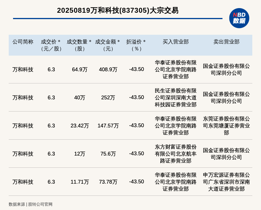 每經訊,2025年8月19日,新三板創(chuàng)新層公司萬和科技(837305,收盤價:11.15元)發(fā)生5筆大宗交易,總成交金額為957.85萬元,成交金額最高的一筆成交價6.3元/股,成交數量64.9萬股,成交金額408.9萬元,折價43.5%。買入營業(yè)部是華泰證券股份有限公司北京學院南路證券營業(yè)部,賣出營業(yè)部是國金證券股份有限公司深圳分公司。