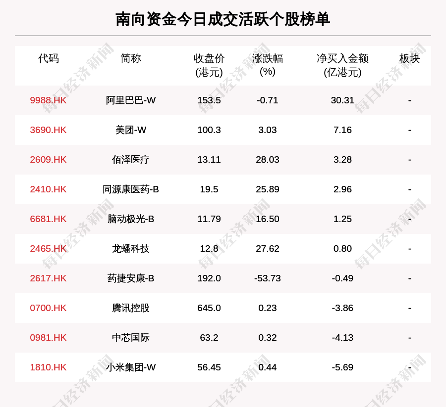 南向資金成交活躍個股榜單中,凈買入個股共6只,金額最多的是阿里巴巴-W(9988.HK,收盤價:153.5港元),凈買入30.313億港元;凈賣出個股共4只,金額最多的是小米集團(tuán)-W(1810.HK,收盤價:56.45港元),凈賣出5.692億港元。