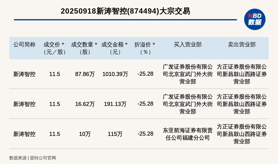 每經(jīng)訊,2025年9月18日,新三板創(chuàng)新層公司新濤智控(874494,收盤(pán)價(jià):15.39元)發(fā)生3筆大宗交易,總成交金額為1316.52萬(wàn)元,成交金額最高的一筆成交價(jià)11.5元/股,成交數(shù)量87.86萬(wàn)股,成交金額1010.39萬(wàn)元,折價(jià)25.28%。買入營(yíng)業(yè)部是廣發(fā)證券股份有限公司北京宣武門外大街營(yíng)業(yè)部,賣出營(yíng)業(yè)部是方正證券股份有限公司新昌鼓山西路證券營(yíng)業(yè)部。