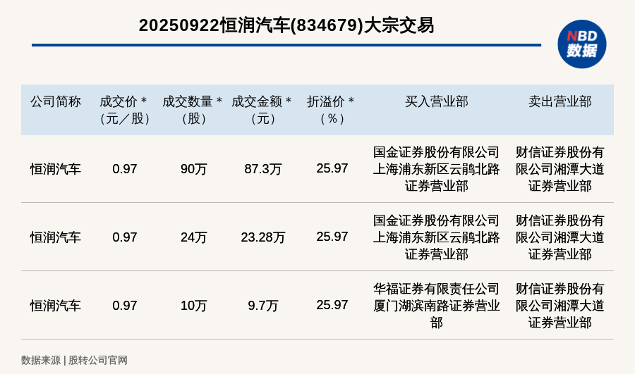 每經訊,2025年9月22日,新三板創(chuàng)新層公司恒潤汽車(834679,收盤價:0.77元)發(fā)生3筆大宗交易,總成交金額為120.28萬元,成交金額最高的一筆成交價0.97元/股,成交數量90萬股,成交金額87.3萬元,溢價25.97%。買入營業(yè)部是國金證券股份有限公司上海浦東新區(qū)云鵑北路證券營業(yè)部,賣出營業(yè)部是財信證券股份有限公司湘潭大道證券營業(yè)部。