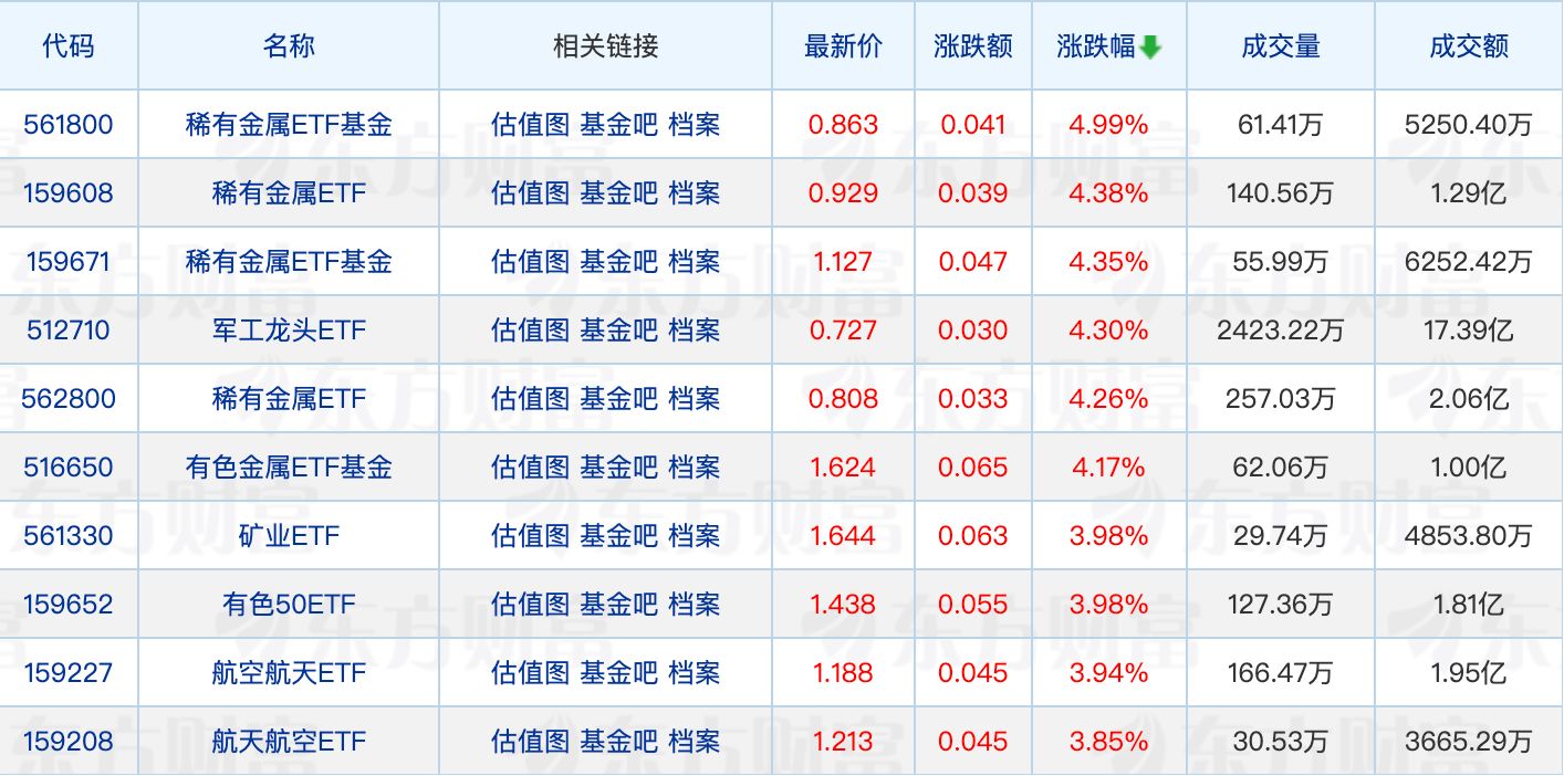 具體來看,稀有金屬相關(guān)ETF集體走強(qiáng),最高漲4.99%。
