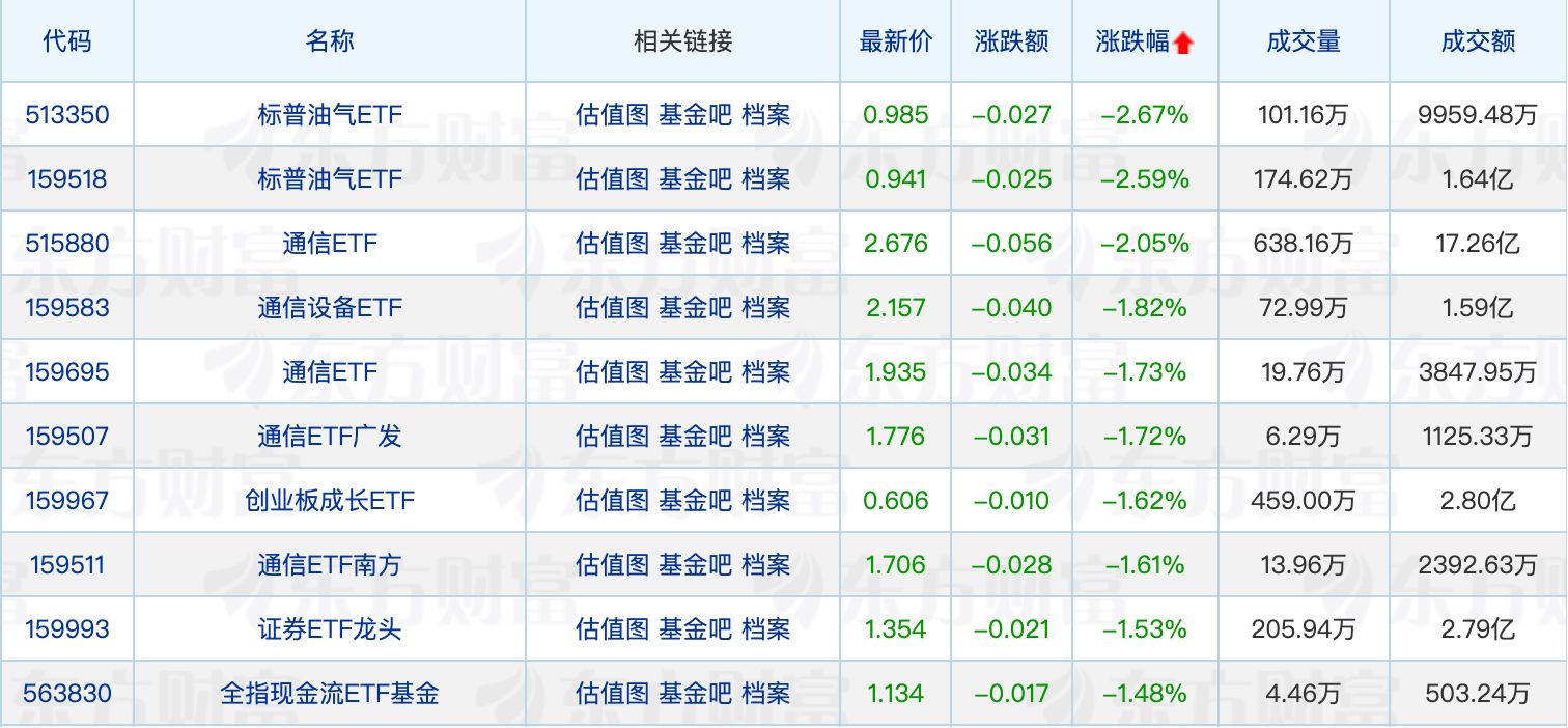 下跌方面,兩只標(biāo)普油氣ETF均下跌超2.5%,多只通信ETF也回調(diào)居前。