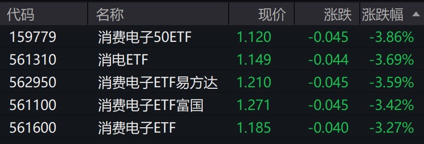 受重倉股調(diào)整影響,跟蹤中證消費(fèi)電子主題指數(shù)的ETF跌超3%。