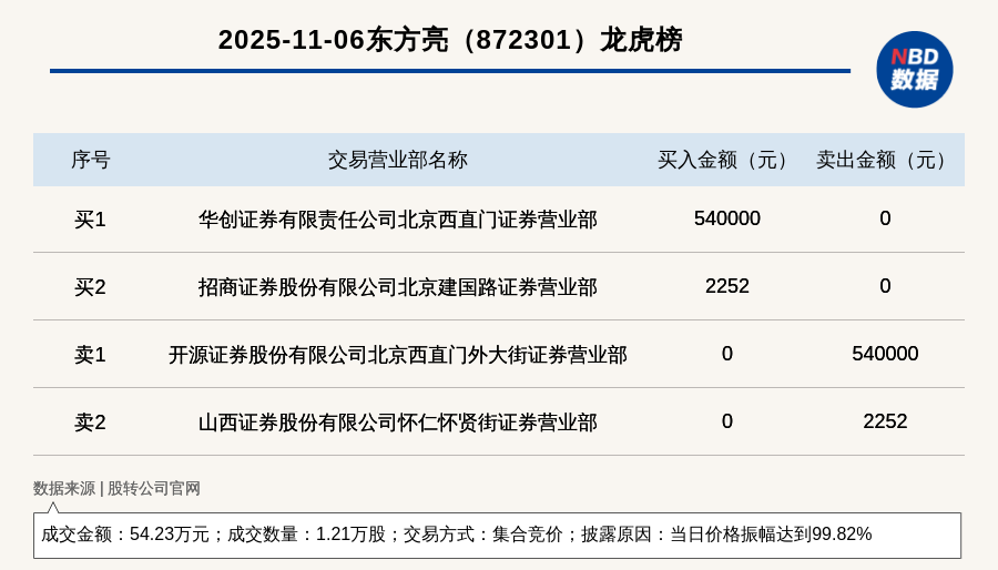 每經(jīng)訊,2025年11月6日,新三板基礎(chǔ)層公司東方亮(872301,收盤價(jià):22.52元)登上龍虎榜,交易方式是集合競(jìng)價(jià),披露原因是當(dāng)日價(jià)格振幅達(dá)到99.82%,成交數(shù)量1.21萬(wàn)股,成交金額54.23萬(wàn)元。買一席位為華創(chuàng)證券有限責(zé)任公司北京西直門證券營(yíng)業(yè)部,買入54萬(wàn)元;賣一席位為開源證券股份有限公司北京西直門外大街證券營(yíng)業(yè)部,賣出54萬(wàn)元。