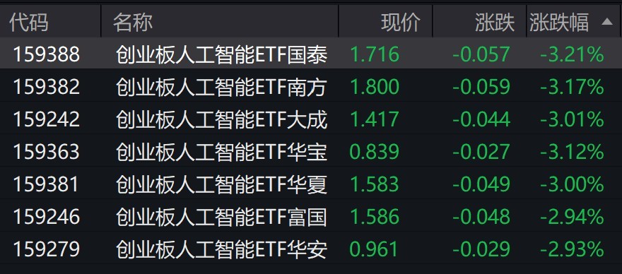 受盤面影響,創(chuàng)業(yè)板人工智能相關(guān)ETF跌約3%。
