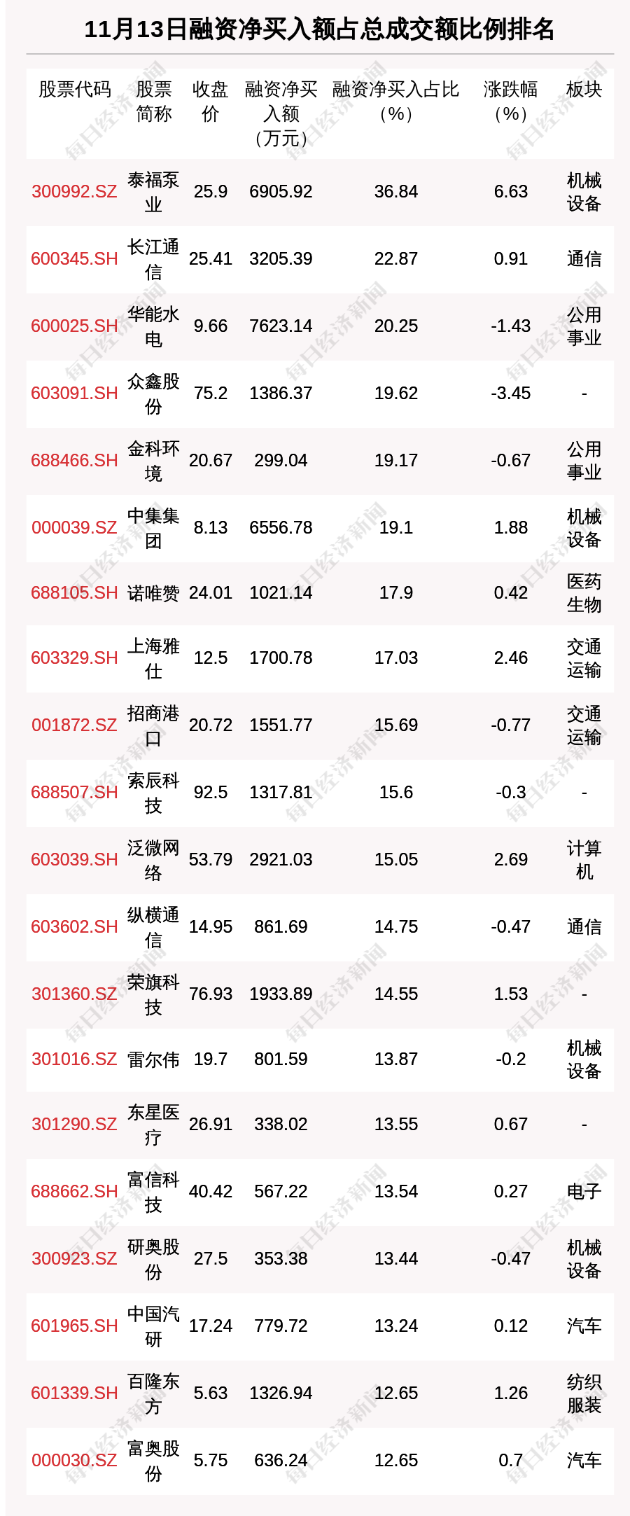 11月13日兩市共有1734只個股有融資資金凈買入。共有54只股票融資凈買入額占總成交金額比例超10%,其中泰福泵業(yè)、長江通信、華能水電排名前三,占比分別為36.84%、22.87%、20.25%。