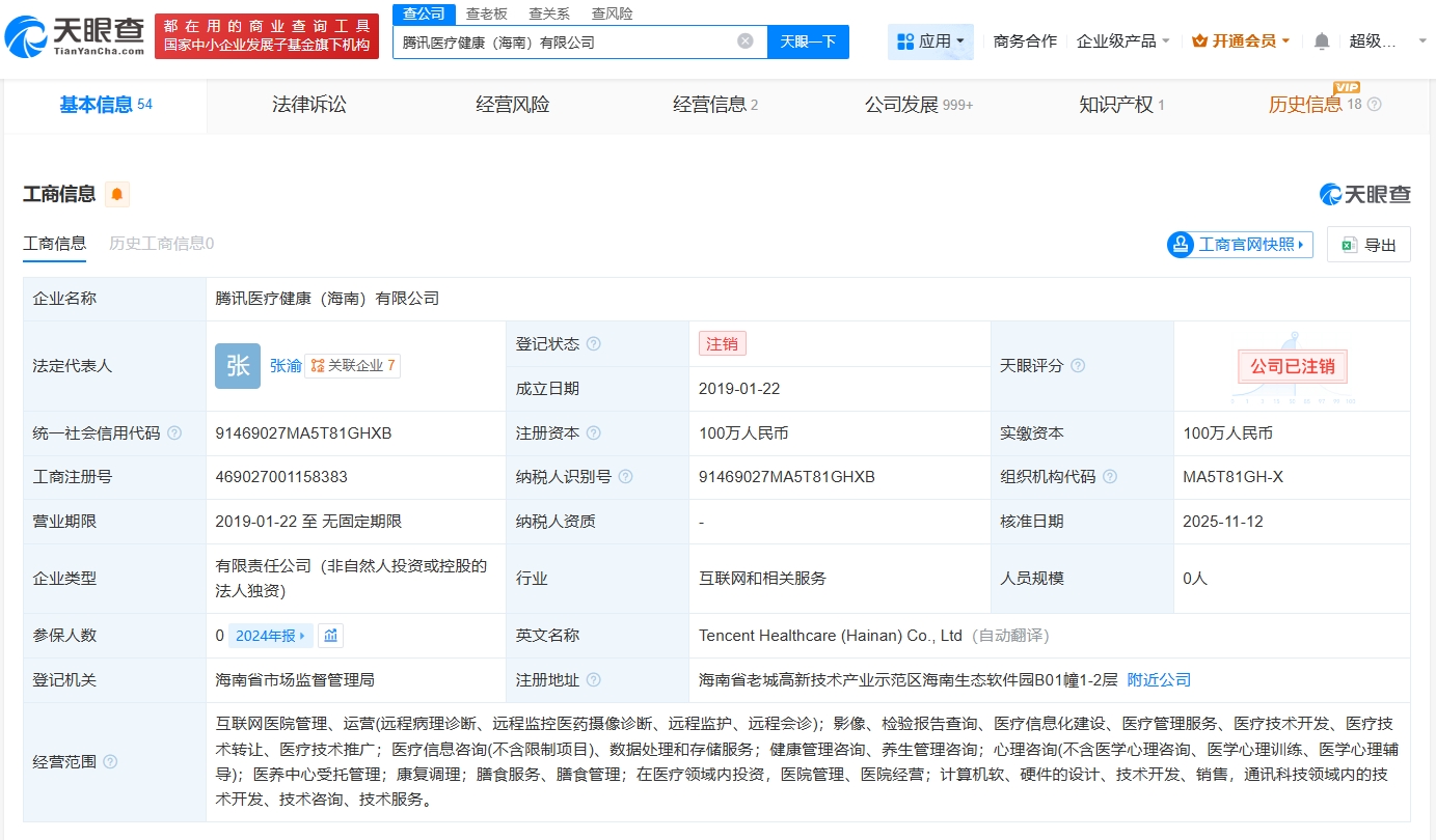 每經(jīng)AI快訊,天眼查工商信息顯示,近日,騰訊醫(yī)療健康(海南)有限公司登記狀態(tài)由存續(xù)變更為注銷。該公司成立于2019年1月,法定代表人為張渝,注冊資本100萬元人民幣,經(jīng)營范圍包括互聯(lián)網(wǎng)醫(yī)院管理、運營,在醫(yī)療領域內投資,健康管理咨詢等。股東信息顯示,該公司由騰訊醫(yī)療健康(深圳)有限公司全資持股。