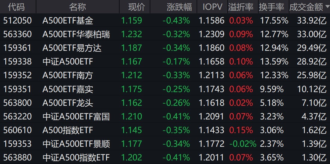 截至上午收盤,場(chǎng)內(nèi)跟蹤中證A500指數(shù)的ETF小幅下跌。其中,有11只中證A500相關(guān)ETF成交額超1億元,3只超29億元。A500ETF基金、A500ETF華泰柏瑞、A500ETF易方達(dá)早盤成交額分別為33.92億元、33億元、29.49億元。