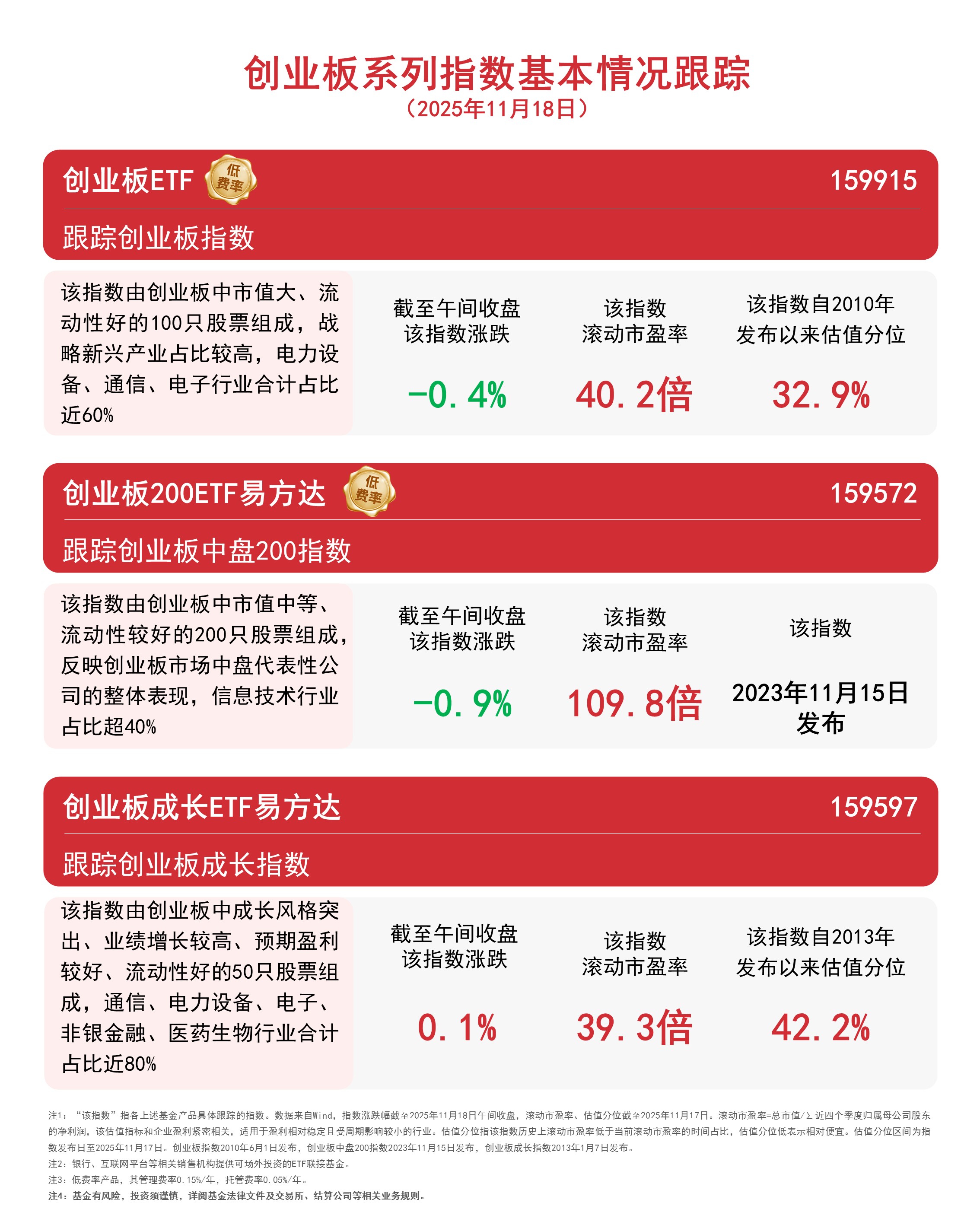 截至午間收盤,創(chuàng)業(yè)板成長指數(shù)上漲0.1%,創(chuàng)業(yè)板指數(shù)下跌0.4%,創(chuàng)業(yè)板中盤200指數(shù)下跌0.9%,創(chuàng)業(yè)板ETF(159915)半日凈申購超1億份。