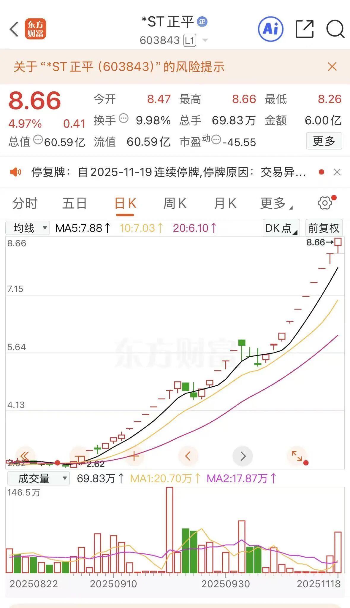 11月18日晚間,*ST正平(603843,股價8.66元,市值60.59億元)公告稱,公司股票自2025年9月1日至11月18日累計漲幅達221.93%,股價短期漲幅與同期上證指數(shù)、建筑行業(yè)存在嚴重偏離,已嚴重脫離基本面。