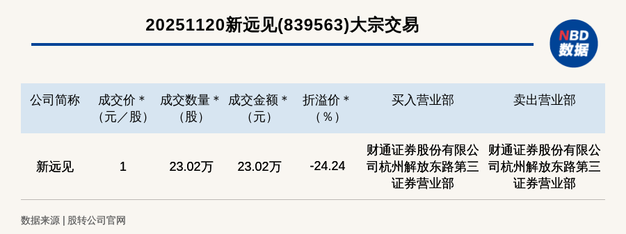 每經(jīng)訊,2025年11月20日,新三板基礎(chǔ)層公司新遠(yuǎn)見(839563,收盤價(jià):1.32元)發(fā)生一筆大宗交易,成交價(jià)1元/股,成交數(shù)量23.02萬(wàn)股,成交金額23.02萬(wàn)元,折價(jià)24.24%。買入營(yíng)業(yè)部是財(cái)通證券股份有限公司杭州解放東路第三證券營(yíng)業(yè)部,賣出營(yíng)業(yè)部是財(cái)通證券股份有限公司杭州解放東路第三證券營(yíng)業(yè)部。