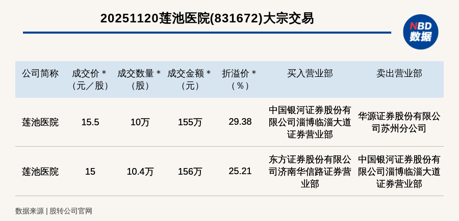 每經(jīng)訊,2025年11月20日,新三板創(chuàng)新層公司蓮池醫(yī)院(831672,收盤價:11.98元)發(fā)生2筆大宗交易,溢價率最高的一筆成交價15.5元/股,成交數(shù)量10萬股,成交金額155萬元,溢價29.38%。買入營業(yè)部是中國銀河證券股份有限公司淄博臨淄大道證券營業(yè)部,賣出營業(yè)部是華源證券股份有限公司蘇州分公司。