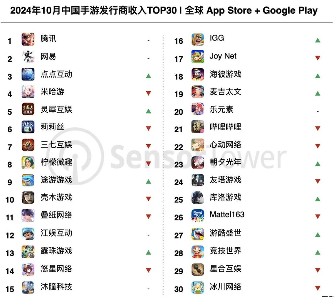 2024年10月米哈游跌出中國手游發(fā)行商全球收入榜前三