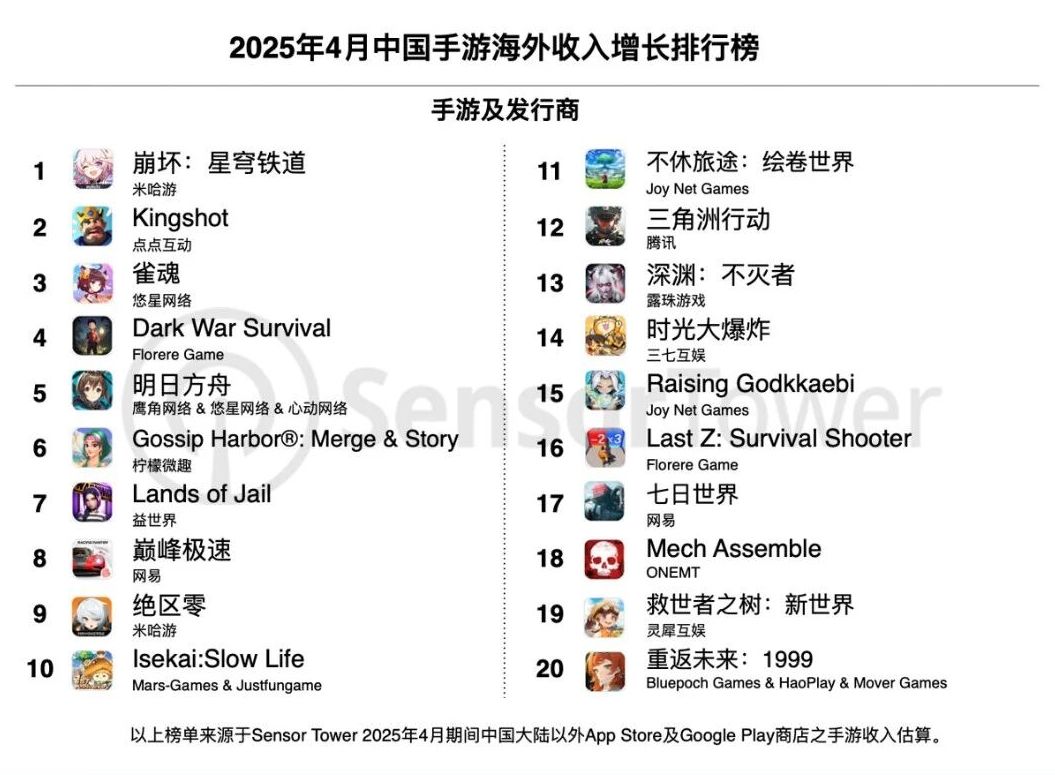 2025年4月《崩壞:星穹鐵道》重回出海手游收入增長榜冠軍