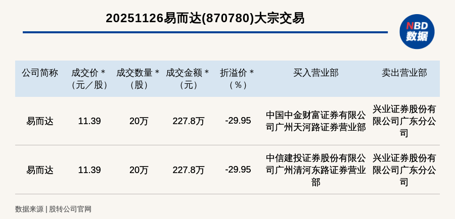 每經(jīng)訊,2025年11月26日,新三板基礎(chǔ)層公司易而達(dá)(870780,收盤價:16.26元)發(fā)生2筆大宗交易,總成交金額為455.6萬元,成交金額最高的一筆成交價11.39元/股,成交數(shù)量20萬股,成交金額227.8萬元,折價29.95%。買入營業(yè)部是中國中金財富證券有限公司廣州天河路證券營業(yè)部,賣出營業(yè)部是興業(yè)證券股份有限公司廣東分公司。