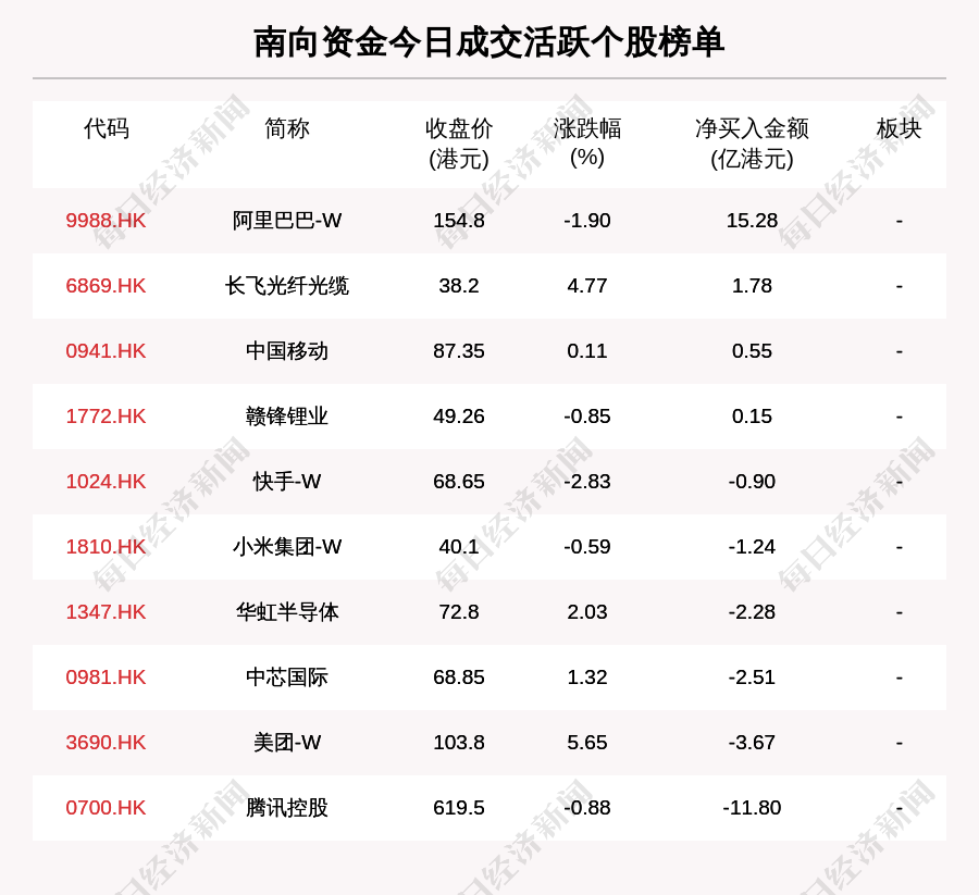 南向資金成交活躍個(gè)股榜單中,凈買(mǎi)入個(gè)股共4只,金額最多的是阿里巴巴-W(9988.HK,收盤(pán)價(jià):154.8港元),凈買(mǎi)入15.282億港元;凈賣(mài)出個(gè)股共6只,金額最多的是騰訊控股(0700.HK,收盤(pán)價(jià):619.5港元),凈賣(mài)出11.798億港元。