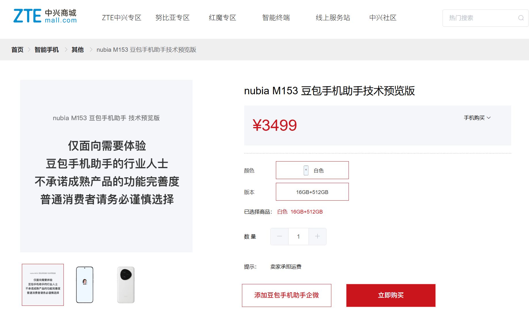 12月1日,字節(jié)跳動旗下AI助手豆包和中興通訊先后宣布,搭載豆包手機助手技術預覽版的工程樣機nubia(努比亞) M153少量發(fā)售。目前該機型在中興商城售賣,僅有16GB+512GB一款配置,售價為3499元。
